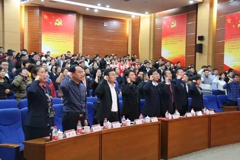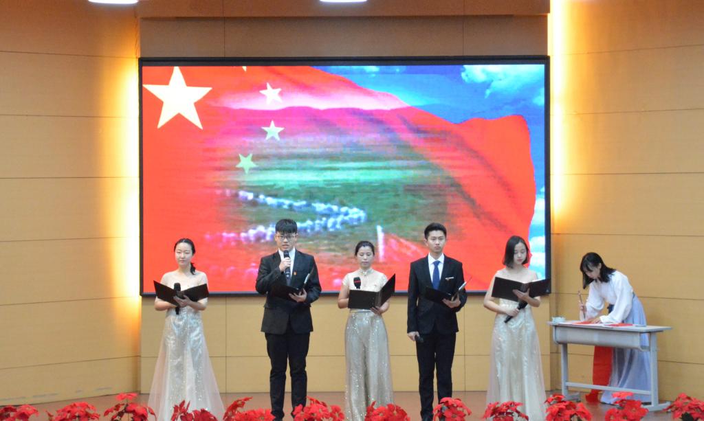 比赛全部表演结束后,在场的全体党员起立,在党旗下一起重温“入党誓词”这一声声激人奋进的诵读坚定了全校党员对共产主义理想信念的执着追求,坚定了不忘初心,砥砺前行,努力为实现中华民族伟大复兴的中国梦而不懈奋斗的信心。